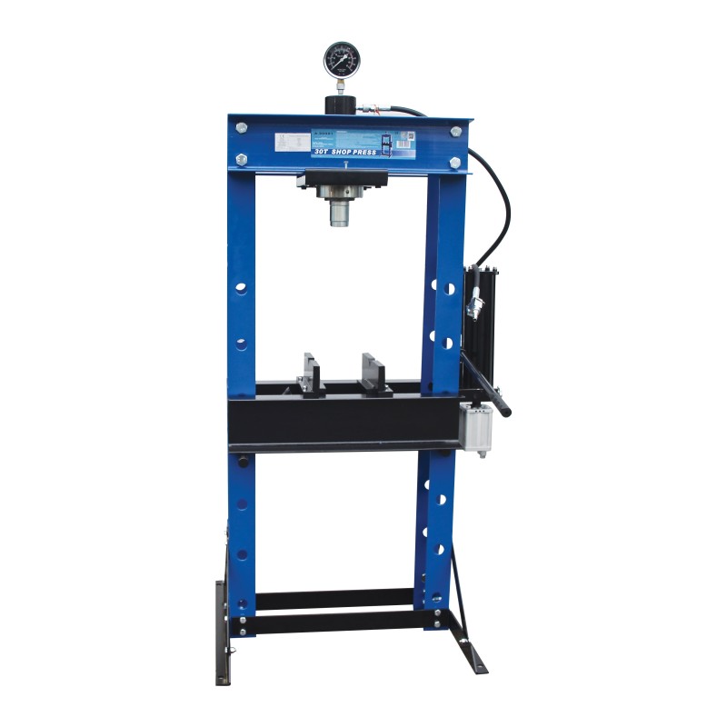30 tonne floor press fitted with ram pressure gauge (filled with glycerine for easy reading) and smooth hydraulic hand pump action to ensure precise force application. H steel frame construction with 145mm cylinder stroke, ideal for automotive garage and engineering workshops for bending or pressing out ball joints, U joints, pulleys etc.